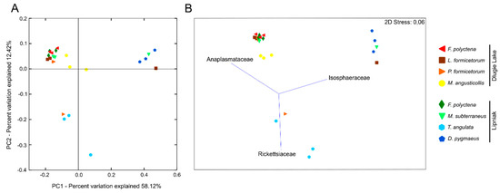 - Funaro, C.F.; Kronauer, D.J.C.; Moreau, C.S.; Goldman-Huertas, B.; Pierce, N.E.; Russell, J.A. Army ants harbor a host-specific clade of Entomoplasmatales bacteria. Appl. Environ. Microbiol. 2011, 77, 346–350. [Google Scholar] [CrossRef] [PubMed]