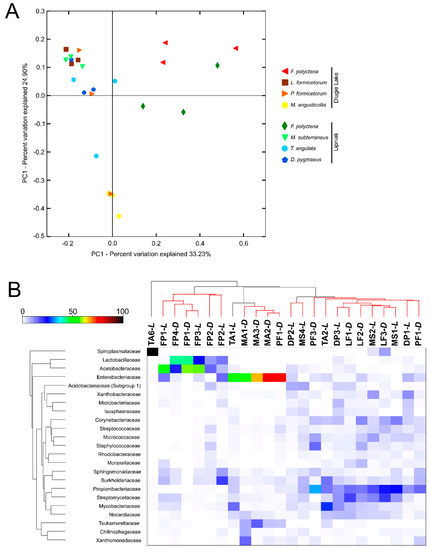 - Kellner, K.; Ishak, H.D.; Linksvayer, T.A.; Mueller, U.G. Bacterial community composition and diversity in an ancestral ant fungus symbiosis. FEMS Microbiol. Ecol. 2015, 91, 1–10. [Google Scholar] [CrossRef] [PubMed]