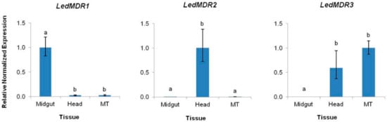 Expression levels of LedMDR1, LedMDR2, and LedMDR3 in the midgut, head, and Malpighian tubules (MT) tissues of adult L. decemlineata. Bars represent the mean normalized fold change of each gene (± SEM, n = 3) relative to the tissue in which each gene is most highly expressed. Different letters represent significantly different expression levels (Tukey’s Honestly Significant Difference (HSD), p < 0.05).