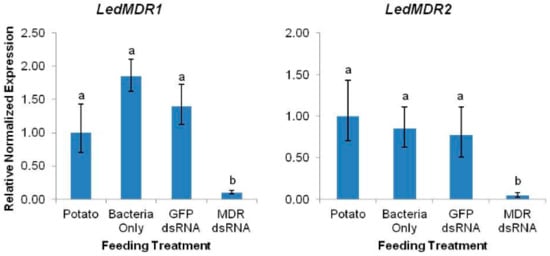 Expression levels of LedMDR1 and LedMDR2 in adult L. decemlineata fed with dsRNA. Expression was measured in combined midgut, head, and MT tissues after three days of feeding on the indicated treatment. Bars represent the mean normalized fold expression (±SEM, n = 6) relative to expression in insects fed with potato. Different letters represent significantly different expression levels within each gene (Tukey’s HSD, p < 0.05).