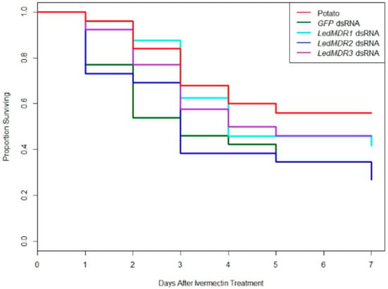 3.3. LedMDR Genes Were Effectively Silenced by Ingested dsRNA