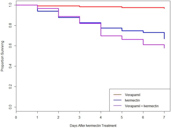 Proportion of adult L. decemlineata surviving in different verapamil and ivermectin feeding treatments. No significant differences were observed between the ivermectin and verapamil + ivermectin groups (log-rank test, χ2(1, 115) = 1.8, p = 0.2).