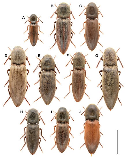 Habitus images of the examined Agriotes species. (A) A. acuminatus; (B) A. lineatus; (C) A. medvedevi; (D) A. modestus; (E) A. obscurus; (F) A. paludum; (G) A. pilosellus; (H) A. rufipalpis; (I) A. sputator; (J) A. ustulatus. Scale bar = 5 mm.