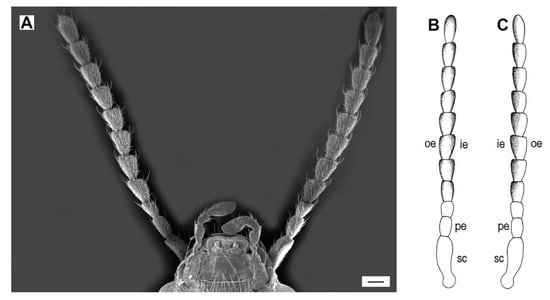 General morphology of Agriotes antennae. (A) A. acuminatus, male, antennae and frontal part of head, ventral view; (B) Sensillar fields on dorsal surface of antennae, schematic; (C) Sensillar fields on ventral surface of antennae, schematic. oe, outer edge; ie, inner edge; sc, scape; pe, pedicel. Scale bar = (A): 100 μm; (B,C): not to scale.