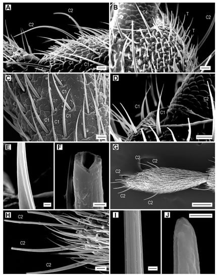 Sensilla chaetica. (A) A. acuminatus, male, numerous sensilla chaetica C1 and C2 on antennomere III; (B) A. lineatus, male, sensilla chaetica and trichodea; (C) A. obscurus, male, sensilla chaetica C1; (D) A. medvedevi, male, sensilla chaetica C1 and C2; (E) A. medvedevi, male, detail of the wall of sensillum C1; (F) A. pilosellus, male, broken sensillum C1; (G) A. modestus, female, antennomere XI, dorsally, sensilla chaetica C1 and C2; (H) dtto, detail; (I) A. modestus, female, striae on the wall of sensillum C2; (J) A. obscurus, male, apex of sensillum C2. Scale bars = (A–D,H): 10 μm; (E,F,I,J): 1 μm; (G): 100 μm.