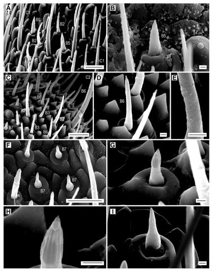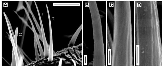 Sensilla chaetica of subtypes C1 and C2 are present in all Coleoptera. The sensilla C1 were correctly identified as sensilla chaetica in all Elateridae so far examined in previous studies [,,,,,,,,,] (Table 5). As in other click-beetles [], these sensilla are widely and evenly distributed on antennae and are more abundant in females. Sensilla C1 are tactile mechanoreceptors responding to mechanical stimuli and enabling the beetle to determine the position of the antennae with respect to its surroundings [,,,].