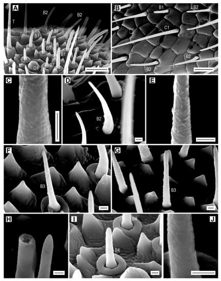 Sensilla basiconica of subtypes B1–B4. (A) A. acuminatus, male, dome-shaped sensillum D1, sensilla trichodea (T) and sensilla basiconica B1, B2, and B7; (B) A. acuminatus, female, sensilla basiconica B1 and B2, and sensilla chaetica C1; (C) A. acuminatus, male, wall pores of sensillum B1; (D) A. medvedevi, male, sensillum basiconicum B2; (E) A. acuminatus, male, detail of the wall of sensillum B2; (F) A. acuminatus, male, sensillum basiconicum B3; (G) A. acuminatus, male, sensillum basiconicum B3; (H) A. pilosellus, female, sensilla basiconica B3, left: broken, right: apical part; (I) A. acuminatus, male, sensilla basiconica B4; (J) A. acuminatus, male, detail of the wall of sensillum B4. Scale bars = (A,B): 10 μm; (C–J): 1 μm.
