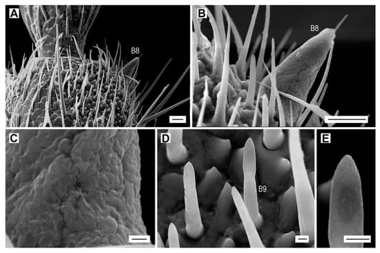 Sensilla basiconica B5 are short stout cones with a characteristic terminal nipple (Figure 7A,B, Table 2). The wall pores are not well visible but their presence is hypothesized. They are usually located in groups of two near the dome-shaped sensilla D1 within the sensillar fields on antennomeres X and XI, but those on antennomere X are missing in both sexes of A. acuminatus and A. paludum, and females of A. medvedevi and A. sputator (Figure 7B, Table 3, Tables S2–S11). Males always have more sensilla B5 than females, and in species with sensilla B5 on the two apical antennomeres, the apical one always bears more sensilla. The total number of sensilla B5 per antenna varies between four (A. paludum) and nine (A. pilosellus, A. ustulatus) in males and between three (A. acuminatus, A. paludum) and seven (A. pilosellus) in females.