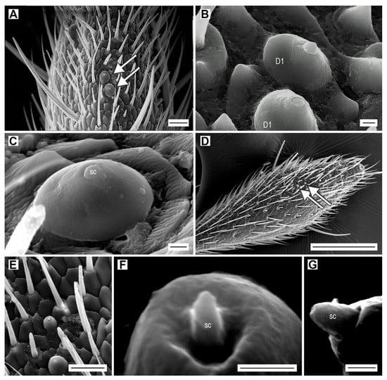 Dome-shaped sensilla. (A) A. acuminatus, male, location of dome-shaped sensilla D1 (arrows) on antennomere XI; (B) detail of dome-shaped sensilla D1; (C) A. rufipalpis, female, dome-shaped sensillum D1 showing the sensory cone (sc); (D) A. medvedevi, male, location of dome-shaped sensilla D2 (arrows) on antennomere XI; (E) A. medvedevi, male, two dome-shaped sensilla D2; (F) A. medvedevi, male, detail of the sensory cone of sensillum D2; (G) A. acuminatus, male, detail of the sensory cone of sensillum D2. Scale bars = (A,E): 10 μm; (B,C,F,G): 1 μm; (D) = 100 μm.