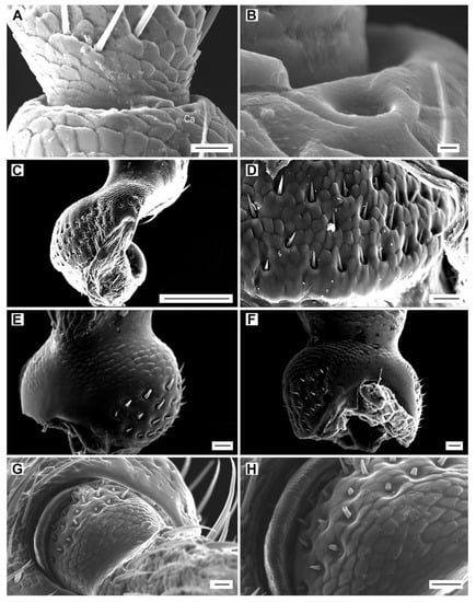 Sensilla campaniformia and Böhm sensilla. (A) A. acuminatus, male, location of campaniform sensillum (Ca) on the distal part of pedicel; (B) detail of campaniform sensillum; (C) A. modestus, male, Böhm sensilla on the scape; (D) detail of Böhm sensilla on the scape; (E) A. lineatus, male, Böhm sensilla on the pedicel, dorsally; (F) A. pilosellus, male, Böhm sensilla on the pedicel, ventrally; (G) A. obscurus, female, Böhm sensilla on the pedicel, dorsally (H) detail of the dorsal region of pedicel with Böhm sensilla. Scale bars = (A,D–G): 10 μm; (B): 0.1 μm; (C): 100 μm; (H): not to scale.