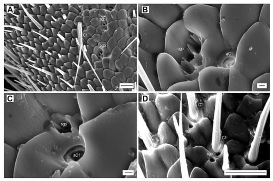 Glandular pores. (A) A. pilosellus, male, location of a single glandular pore (sgp) and a cluster of glandular pores (cgp), and sensillum chaeticum C1; (B) cluster of glandular pores near alveolus of sensillum C1 (aC1); (C) single glandular pore near alveolus of sensillum C1; (D) A. medvedevi, male, glandular pores near bases of sensilla chaetica C1. Scale bars = (A,D): 10 μm; (B,C): 1 μm.
