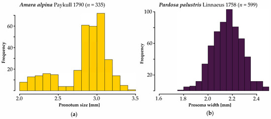 Frequency histograms of pronotum width (Amara alpina, (a); n = 335) and prosoma width (Pardosa palustris, (b); n = 599) in this study. The color scheme (A. alpine—yellow, P. palustris—dark blue) is used in subsequent figures to enhance interpretation.