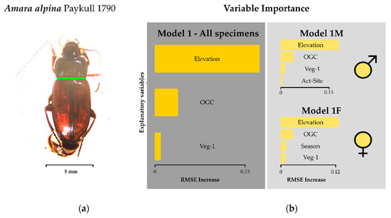 Model results for pronotum width: (a) green bar on photograph indicates location of measurement, (b) variable importance determined by RMSE increase of model permutations) of the ground beetle Amara alpina. See Table 2 for model formulation and Table 1 for a detailed description of model parameters. Variables used here are Elevation, OGC = open ground cover, Veg-1 = number of plant species, Act-Site = activity–abundance of A. alpina per site. Results are given for all specimens (dark grey field) and based on sex (light grey field).