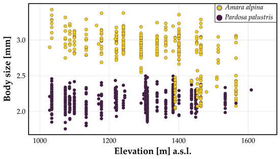 Body size patterns of Amara alpina (yellow marks) and Pardosa palustris (purple marks) along the elevational gradient.