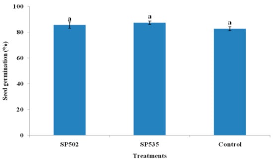 Effect of Cordyceps fumosorosea isolates on percent germination of eggplant seeds. Error bars indicate the standard error of means based on five replicates (n = 5). Bars having different letters indicate that means are significantly different from each other at a 5% level of significance.