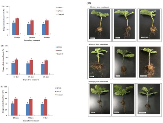 The fungal colonization of eggplant leaves at different time intervals varied significantly among different C. fumosorosea isolates and control after 30, 45, and 60 days of fungal treatment. Cordyceps fumosorosea SP535 treatment resulted in 58%, 57%, and 56% colonization of leaves after 15, 30, and 60 days of fungal treatment, respectively, whereas 41%, 40%, and 40% of plant leaves were colonized after 30, 45, and 60 days of treatment with C. fumosorosea SP502 (Figure 4C).