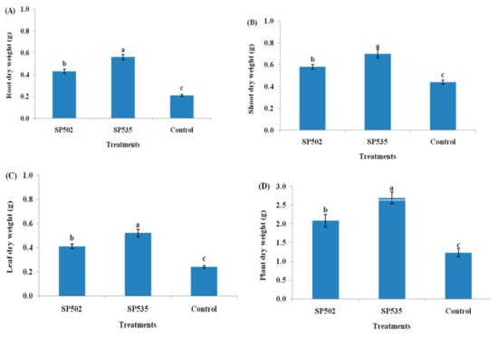 The C. fumosorosea SP535 treatment resulted in 118% higher plant dry weight compared with control, whereas plant dry weight in response to C. fumosorosea SP502 was 69% higher than the control (Figure 3D). Cordyceps fumosorosea SP535 treatment caused 166% higher root dry weight production compared with control, whereas root dry weight in response to C. fumosoroseaSP502 was 104% higher than control (Figure 3A). Cordyceps fumosorosea SP535 treatment resulted in 59% higher shoot dry weight compared with control, whereas shoot dry weight in response to C. fumosoroseaSP502 was 31% higher than control (Figure 3B). Cordyceps fumosoroseaSP535 treatment resulted in 116% higher leaf dry weight compared with control, whereas leaf dry weight in response to C. fumosorosea SP502 was 71% higher than control (Figure 3C).