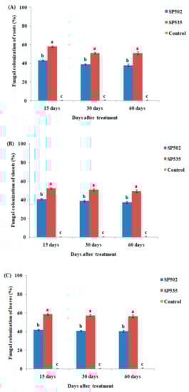 Percent colonization of different plant parts by Cordyceps fumosorosea isolates after 30 days, 45 days and 60 days of fungal treatment. (A) Roots; (B) shoot; and (C) leaves. Error bars indicate the standard error of means based on five replicates (n = 5). Bars having different letters indicate that means are significantly different from each other at 5% level of significance.