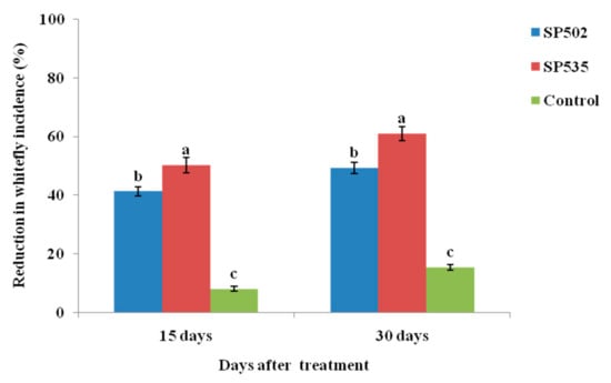 The colonization of eggplants by both C. fumosorosea isolates resulted in significant reduction of B. tabaci incidence when compared with control after 15 and 30 days of insect inoculation. The reduction in B. tabaci incidence in response to colonization by C. fumosorosea isolate SP535 was significantly higher than that observed for C. fumosorosea isolate SP502 (Figure 5).