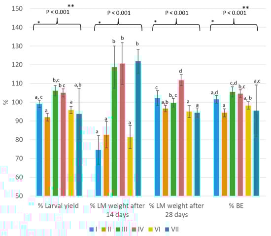 Data in Table 3 confirmed that the reference diet (diet F) resulted in the best larval production. Figure 1 provides more details on the larval performance parameters that were measured for diet F throughout all different trials and expressed as normalised values. On the basis of all six treatments with the reference diet, an actual average yield per tray of 992.96 ± 55.45 g was calculated, the actual average LM weight at 14 days was 2.38 ± 0.53 mg, and the actual average LM weight at 28 days was 20.01 ± 1.31 mg. Significant variations (p < 0.05) were notable for all four parameters. The percentage larval yield (p < 0.001) varied over the six trials between 92% and 106%. Trials II and VI resulted in significantly lower percentage yields compared to trials III and IV. The p-value for percentage larval weight at day 14 and day 28 were smaller than 0.001. In respect to percentage larval weight, after 14 days of rearing, trials III, IV, and VII had a significantly higher percentage (119%–122% versus 75%–83%), whereas after 28 days the values of all trials were situated between 95%–102%, except for trial IV (112%). The percentage of BE varied between 94% and 106%.