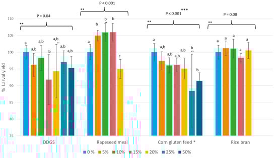 Figure 2 illustrates the percentage larval yield for all mixed diets, grouped according to the type of the second side-stream. On the basis of the ANOVA assay, significant differences (p < 0.05) were detected between the inclusions of all side-streams except for rice bran. Replacement of wheat middlings by rice bran, up to 20%, did not significantly impact the percentage larval yield (p-value = 0.08). The same observation was made for lower inclusion percentages (0% until 15%) of corn gluten feed, whereas for a 25% or 50% replacement of the wheat middlings by corn gluten feed, a negative effect was observed. Partial replacement of wheat middlings by DDGS led to percentage larval yield ranging between 92% and 98%. A significant lower value was obtained with the 15% inclusion in comparison to the reference diet. All other inclusions had no significant impact. Rapeseed meal (tested up to an inclusion of 20%), on the other hand, resulted in a clear improvement on the percentage larval yield with 5% to 15% replacement of wheat middlings by rapeseed meal (105%–106%). A replacement of 20%, however, led to a significant decrease of percentage larval yield compared to the reference (0% inclusion).