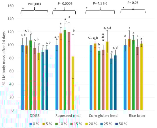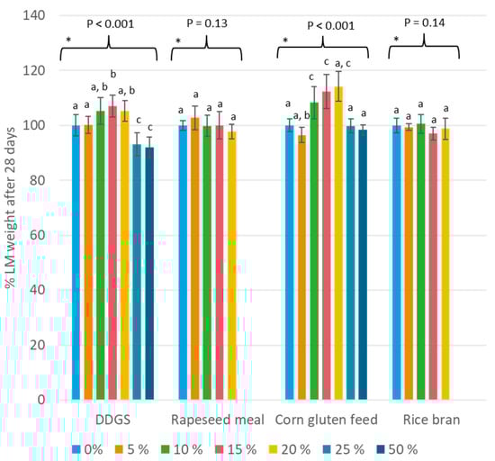 At the end of the rearing, the results and conclusions based on percentage larval weight (day 28) were different for some aspects (see Figure 4). Again, no significant changes in larval weight were detected when rice bran was incorporated (p = 0.14), but a similar conclusion was also true for rapeseed meal (p = 0.13) at day 28. A high percentage of DDGS resulted in a significant decreased larval weight, whereas at day 14 only a trend was observed. On the other hand, smaller incorporations of DDGS (15%) or corn gluten feed (10%–15%) slightly increased the larval weight above 100%, pointing towards a slightly but significantly positive trend.