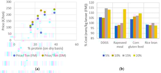 (a) Correlation between relation of protein content of side-streams and their price (in euros) on product basis (fresh matter, FM) and dry matter (DM) basis. (b) Effect on the cost price of side-stream inclusions in the reference diet compared to the cost price of the reference diet (100% cost).