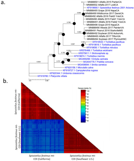 Analyses of mitochondrial cytochrome C oxidase I (mt-COI) consensus sequences (547 nucleotides) from Spissistilus festinus populations collected from various locations, years, and crops in California and the Southeastern United States. (a) Bayesian inferential analysis indicating two distinct genotypes based on geographic location. Membracid mt-COI sequences determined in this study are denoted in black; the sequences retrieved from GenBank and used for comparison are denoted in blue. Numbers at the nodes indicate Bayesian posterior probability. Nodes denoted with a black dot indicate support by Maximum Likelihood analysis with at least 90% bootstrap support (1000 bootstrap replicates). (b) Pairwise identity matrix based on MUSCLE alignment of sequences from individual specimens. Each square depicts a pairwise comparison, where red indicates high sequence identity (>98%) and blue indicates lower (88%–90%) sequence identity. Note the high homogeneity among sequences within populations, and a distinction between mt-COI sequences from S. festinus specimens from California and the Southeastern United States.
