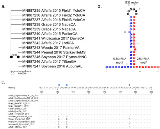 Analyses of internal transcribed spacer 2 (ITS2) sequences (495 nucleotides) from Spissistilus festinus populations collected from various locations, years, and crops in California and the Southeastern United States. (a) Phylogeny produced by Bayesian inferential analysis (with posterior probability indicated at the node) with the crop, location, and year of collection indicated in the node names. Black dots at nodes indicate bootstrap support of at least 80%, through Maximum Likelihood analysis (1000 bootstrap replicates). (b) Depiction of 5.8S (blue) and 28S (red) motifs denoting the boundaries of the ITS2 region (black) used as a nuclear marker for genetic variation among populations of S. festinus. (c) Segment of MUSCLE alignment of ITS2 sequences in which three nucleotide differences at positions 141, 146, and 186 were observed between S. festinus specimens from California and the Southeastern United States.