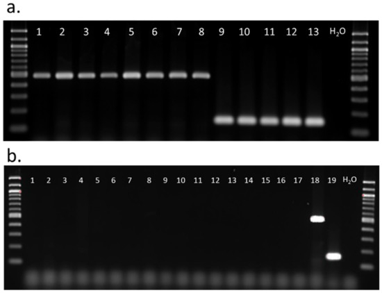 (a) Diagnostic polymerase chain reaction for DNA sequence-based identification of specimens of the S. festinus genotype from California (lanes 1–8) and the Southeastern United States (lanes 9–13). (b) Specificity of the diagnostic PCR against other Membracidae (lanes 1–4), Cercopidae (lanes 5–6), Fulgoroidea (lanes 7–8), Cicadellidae (lanes 9–14), Aphididae (lane 15), Aleyrodidae (lane 16), and Psylloidea (lane 17) compared to the S. festinus genotype from California (lane 18) and the Southeastern United States (lane 19).