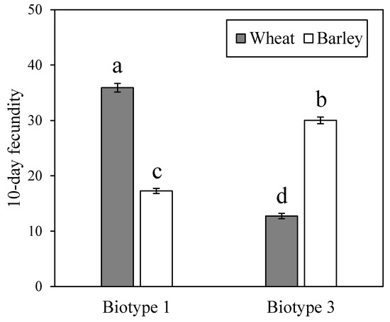 Comparisons of 10 d fecundities for two Sitobion avenae biotypes on barley and wheat (different letters on bars indicate significant differences among treatments at α = 0.05, ANOVA followed by Tukey tests).
