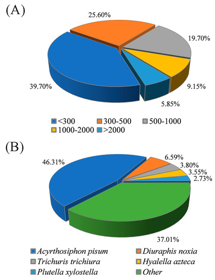 For functional annotation, 40.52% (57,961) of all the unigenes matched entries in databases of NR, NT, KO, Swiss-Prot, PFAM, GO or KOG (Table S2). In total, 8420 (5.89%) unigenes had matches in all seven databases. In total, 35,636 (24.91%) and 44,988 (31.45%) unigenes showed hits in the databases NR and NT, respectively. The highest percentage of S. avenae unigenes were matched with sequences for Acyrthosiphon pisum (46.31%), followed by Diuraphis noxia (6.59%), Trichuris trichiura (3.80%), Hyalella azteca (3.55%), and Plutella xylostella (2.73%) (Figure 2B).