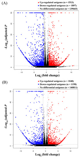 In total, 343,816,452 raw reads and 337,188,919 clean reads were obtained in this study (Table 1). The Q20 of all samples was >98.66%, and the Q30 was >96.18%, showing the high quality of the RNA-Seq analysis. Each sample library was mapped back to the full assembly, with overall alignment rates of 71.67%–73.23%. The de novo assembly yielded 143,058 unigenes. The median length of these unigenes was 358 bp, with a N50 (length N for which 50% of all bases in the assembly are located in a unigene of length < N) of 1012 bp. As shown in Figure 2A, the unigenes of length < 300 bp and >500 bp accounted for 39.70% and 34.70% of the total, respectively, whereas 25.60% of all the unigenes fell between 300 and 500 bp.