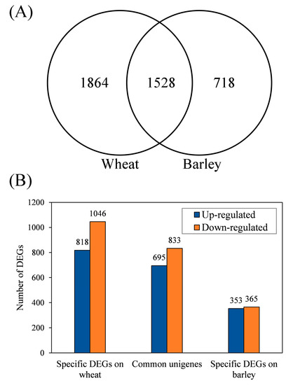 On wheat, 3392 DEGs (adjusted p values <0.05, fold change values >2) were detected between S. avenae biotypes 1 and 3 (Figure 3). For these DEGs, 1513 of them were up-regulated, and 1879 were down-regulated in biotype 3 compared to biotype 1 (biotype 3 vs. biotype 1). On barley, 1048 up- and 1198 down-regulated genes (2246 DEGs in total) were detected between the two biotypes (biotype 3 vs. biotype 1). In addition, 1528 DEGs (referred to as common DEGs hereafter) occurred in the two biotypes feeding on both wheat and barley (Figure 4A), and they included 695 up-regulated genes and 833 down-regulated genes (biotype 3 vs. biotype 1, Figure 4B). One thousand eight hundred sixty-four and 718 DEGs (referred to as specific DEGs hereafter) occurred only in the two biotypes feeding on wheat and barley, respectively (Figure 4A). Of the 1864 specific DEGs on wheat, 818 and 1046 genes were up-regulated and down-regulated, respectively (biotype 3 vs. biotype 1) (Figure 4B). Of the 718 specific DEGs on barley, 353 and 365 genes were up-regulated and down-regulated, respectively (biotype 3 vs. biotype 1) (Figure 4B).
