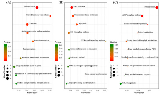 Top 10 enriched KEGG pathway categories for common DEGs (A), specific DEGs on wheat (B), and specific DEGs on barley (C) (bubble color indicates Q-value, bubble size indicates the gene number in KEGG pathways).