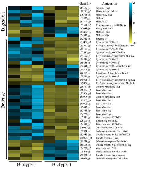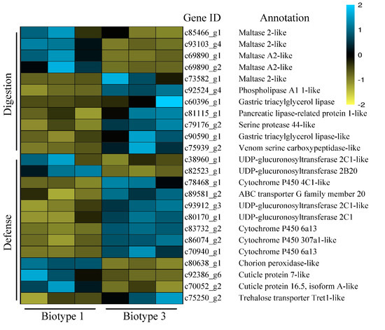 Based on the results of the above-mentioned enrichment analyses, transcriptional changes associated with defense and digestion were further explored. For common DEGs, 16 genes related to digestion were identified, including three serine proteases, five lipases, three phospholipases, two carbohydrases, one maltase, one galactosidase, and one mannosidase (Table 5). Of them, two phospholipases [log2(fold change): 8.35–8.99] and one lipase [log2(fold change): 1.97–2.46] were up-regulated in biotype 1 compared with biotype 3. Forty common DEGs related to defense were also identified, including eight cytochrome P450 monooxygenases (P450s), six UDP-glycosyltransferases (UGTs), three glutathione S-transferases (GSTs), four esterases (ESTs), six peroxidases (PODs), two cuticle proteins (CPs), one heat shock protein (HSP), one superoxide dismutase (SOD), and etc. Among these defense-related DEGs, 13 genes (i.e., four P450s, one GST, two UGTs, the ABC transporter, two alkaline phosphatases, two ESTs and one CP) were up-regulated in biotype 3 compared with biotype 1, whereas the other genes showed higher expression in biotype 1. Among these, the top defense-related common DEGs (biotype 3 vs. biotype 1) with the most significant changes included three PODs [log2(fold change) for c81908_g2: −8.48 to −12.42; for c58802_g1: −5.56 to −5.86; for c86869_g1: −3.57 to −3.63], two CPs [log2(fold change) for c65501_g1: −6.57 to −6.68; for c81826_g1: 4.8 to 5.94], one SOD [log2(fold change): −4.71 to −5.12], one EST [log2(fold change): 3.21 to 4.02], one HSP [log2(fold change): −2.38 to −4.76], two UGTs [log2(fold change) for c91399_g1: −2.18 to −3.32; for c89981_g3: −2.41 to −3.11], and one GST [log2(fold change): 2.84–3.01].