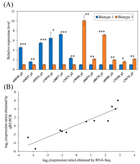 In order to verify the results of the above-mentioned RNA-seq analysis, the expression of 12 selected genes was examined by using the qRT-PCR (quantitative reverse transcription-polymerase chain reaction) method. The gene NADH (nicotinamide adenine dinucleotide dehydrogenase, c93747_g4) was chosen as the reference gene because of its consistent expression in our study [M (stability measure value) = 0.177, SV (stability value) = 0.039]. Gene-specific primers were designed by using Beacon Designer version 8.0 (Premier Biosoft, Palo Alto, CA). All the primers used are listed in Table S1. PCR reactions were prepared with the SYBR Premix Ex Taq™ Kit (Takara, Dalian, China) according to the manufacturer’s instructions. All qRT-PCR reactions were performed on the Roche LightCycler® 480 II system (Roche Diagnostics Ltd., Rotkreuz, Switzerland), with three biological replicates and two technical replicates for each gene. The qPCR cycling parameters were as follows: 95 °C for 5 min, followed by 40 cycles of 95 °C for 10 s and 60 °C for 30 s. To confirm the homogeneity of the PCR products, reaction stages for establishment of melt curves (95 °C for 5 s, 65 °C for 1min, and 95 °C for 5 s) were also included. The relative expression level of each gene was calculated by using the 2−ΔΔCt method [41]. The relative expression levels and FPKM values of each gene were compared between the two biotypes by using the student t test in the software SPSS Statistics 23 (IBM SPSS Statistics Inc., Chicago, IL, USA).