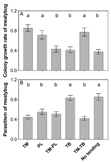 - Xu, C.; Su, J.; Qu, X.B.; Zhou, A.M. Ant-mealybug mutualism modulates the performance of co-occurring herbivores. Sci. Rep. 2019, 9, 13004. [Google Scholar] [CrossRef] [PubMed]