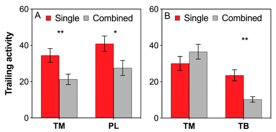 Effects of interference competition on ant trailing activity. (A) T. melanocephalum-P. longicornis interaction; (B) T. melanocephalum-T. bicarinatum interaction. The data are presented as the mean ± SE. Asterisk (* or **) on bars indicates significant differences between the treatments (P < 0.05 or P < 0.01). Tapinoma melanocephalum, Paratrechina longicornis and Tetramorium bicarinatum were abbreviated into TM, PL and TB, respectively.