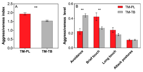 Effects of interference competition on ant aggressiveness. (A) aggressiveness index; (B) percentage aggressiveness level. The data are presented as the mean ± SE. Asterisk (**) on bars indicate indicates significant differences between the ant treatments (P < 0.01). Tapinoma melanocephalum-Paratrechina longicornis confrontation and Tapinoma melanocephalum- Tetramorium bicarinatum confrontation were abbreviated into TM-PL and TM-TB, respectively.
