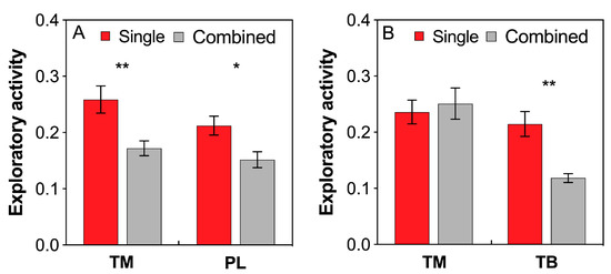 Effects of interference competition on ant exploratory activity. (A) T. melanocephalum-P. longicornis interaction; (B) T. melanocephalum-T. bicarinatum interaction. The data are presented as the mean ± SE. Asterisk (* or **) on bars indicates significant differences between the treatments (P < 0.05 or P < 0.01). Tapinoma melanocephalum, Paratrechina longicornis and Tetramorium bicarinatum were abbreviated into TM, PL, and TB respectively.