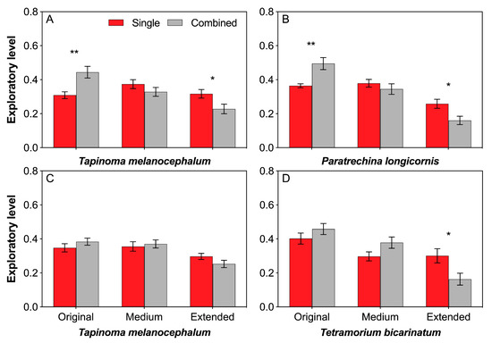 Effects of interference competition on ant exploratory level. (A,B) T. melanocephalum-P. longicornis interaction, (A) exploratory level of T. melanocephalum; (B) exploratory level of P. longicornis. (C,D) T. melanocephalum- T. bicarinatum interaction, (C) exploratory level of T. melanocephalum; (D) exploratory level of T. bicarinatum. The data are presented as the mean ± SE. Asterisk (* or **) on bars indicates significant differences between the treatments (P < 0.05 or P < 0.01).