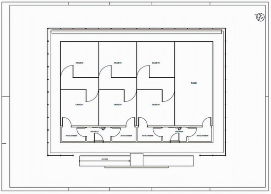 The guiding principle of the SFS was to prevent Wolbachia-infected mosquitoes from escaping. The SFS had two main entrances, both with autolocking and keys only available to Fiocruz staff. Two internal vestibules of 4.85 m2 each were equipped with stainless steel benches and a sink to support standard laboratory work. Vestibules had two doors providing access to antechambersof 4.80 m2 each. Antechambers provided access to the cages in which experimental releases were conducted, as described below. All doors were equipped with air curtains to prevent mosquitos from escaping. The 176 m2 space available for releases was divided into seven smaller sections: a 44.3 m2 room to rear mosquitoes used in the experiments and six 21 m2 cages where releases were conducted (Figure 1). Each of the six cages had an auto-locking door that could only be opened once the entry door was closed. A corridor 2 m wide separated cages from the main entrance. The door dividing the cages had overlapping screens composed of fine polyester cloth and a metal chain weight sewn into the bottom to ensure the screens securely overlapped. Every cage had plants and at least one table with two chairs to serve as shelters for mosquitoes. The SFS of Fiocruz was inspired by the field cage located at James Cook University in North Queensland provided [29].