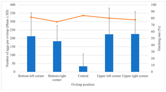Number of eggs (mean ± SD) as bars and hatching rate as the line as functions of ovitrap positioning after 20 Aedes aegypti females were released into the SFS.