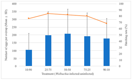 Number of eggs (mean ± SD) as bars and hatching rate as the line as functions of treatment (Wolbachia-infected/-uninfected) after 20 Aedes aegypti females were released into the SFS.