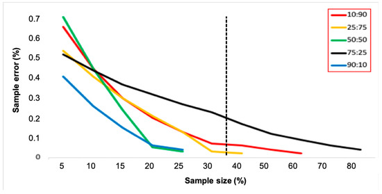 The relation between sampling error and sampling size observed during pilot releases in the SFS. Each line represents one of the treatments tested. The vertical dashed line represents a constant sampling size of 35% screened larvae employed during field releases.