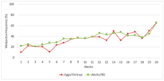Sampling mosquito specimens from the field provides the opportunity to enhance our knowledge of vector biology and disease transmission. Nowadays, there is extensive information regarding the methods, devices, and strategies to sample mosquitoes. In recent years, several mosquito traps have been developed to capture Ae. aegypti females, but the simplest and cheapest tool, the ovitrap, is still widely used worldwide. The reasons underlying the high acceptability of ovitraps include its practicality, low price, high sensitivity, and good acceptance by householders to maintain the trap over the study period [24,32,33]. Therefore, we sought to evaluate whether data gathered by ovitraps are able to estimate the frequency of the endosymbiont maternally inherited Wolbachia during its deployment in natural settings, compared to the most traditional trapping tool, the BG-Sentinel trap.