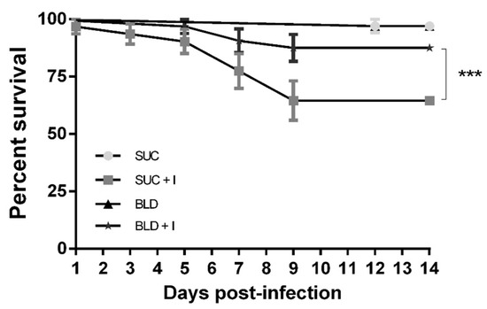 Susceptibility of Aedes aegypti adult female mosquitoes to fungal infection. SUC, sucrose-fed mosquitoes treated with Tween 80 (control); SUC + I, sucrose-fed mosquitoes infected with M. anisopliae; BLD, blood-fed mosquitoes treated with Tween 80 (control); BLD + I, blood-fed mosquitoes infected with M. anisopliae. Survival rates of A. aegypti (n = 45 per treatment) exposed to conidia of M. anisopliae ESALQ (ESALQ818) at a final dose of 106 spores mL−1. The graph represents three independent experiments and data were analyzed with Kaplan–Meier survival analysis (GraphPad Prism 6 software). Error bars indicate the SEM. The fungus significantly increased SUC + I mortality compared to all other treatments (*** p < 0.001).