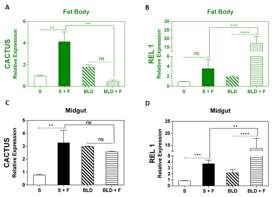 After confirming that blood feeding resulted in reduced susceptibility to fungal infection, we further investigated the role of canonical immune pathways during this process. Since Toll is the major immune pathway responsible for the antifungal response, we analyzed the Cactus and REL1 components in the midgut and fat body of infected mosquitoes following feeding on both sugar and blood. Expression analysis showed that the negative regulator Cactus was upregulated in the fat body of infected sugar-fed mosquitoes, while REL1 was not significantly affected (Figure 2A,B). However, in the fat body of blood-fed mosquitoes infected with the fungus, we observed a contrasting result. Cactus was not upregulated, but REL1 was significantly upregulated upon infection. In comparison, expression analysis in the midgut revealed that Cactus was significantly upregulated in fungus-infected sugar-fed mosquitoes. In the fungus-infected blood-fed mosquitoes, Cactus expression did not differ from uninfected control. However, the levels of Cactus in the blood-fed were not significantly different from the fungus-infected sugar-fed mosquitoes (Figure 2C). REL1 was upregulated in the midgut of both blood-fed and sugar-fed mosquitoes infected with fungus (Figure 2D).