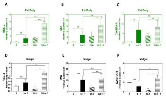 The expression analyses of IMD marker components revealed that REL2 and IMD were upregulated in the fat body of fungus-infected blood-fed mosquitoes (Figure 3A,B). In the fungus-infected sugar-fed mosquitoes, the aforementioned genes showed no significant regulation upon infection (Figure 3A,B). Caspar, a negative modulator of the IMD pathway, showed no significant upregulation in the fat body of fungus-infected regardless of diet, even though there was a trend toward upregulation (Figure 3C). In the midgut, regulation tended to follow a similar pattern in relation to the fat body. Both REL2 and IMD were upregulated in blood-fed mosquitoes after infection (Figure 3D,E). IMD, in particular, was upregulated in the midgut of fungus-infected mosquitoes regardless of diet (Figure 3E). Caspar did not show any significant change in the midgut of fungus-infected sugar-fed, but in blood-fed mosquitoes, it was upregulated after infection (Figure 3F).